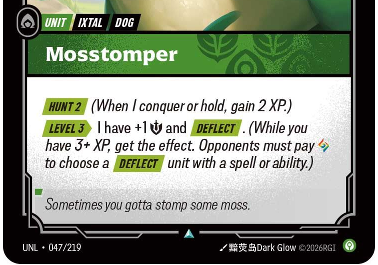 Level 3 means this unit gains the stated effect permanently while your Legend has 3 or more XP. No spending required. The ability is always active as long as you meet the threshold. For Mosstomper that is +1 Might and Deflect, meaning opponents must pay a Wild Power cost to target it with a spell or ability.